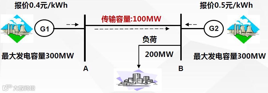 通过例子比较方便理解,即节点电价由系统电能价格与阻塞价格构成。系统电能价格反映全系统的电力供需平衡情况,阻塞价格反映不同节点的电网阻塞情况。节点电价反映电力商品在不同地点的价值。