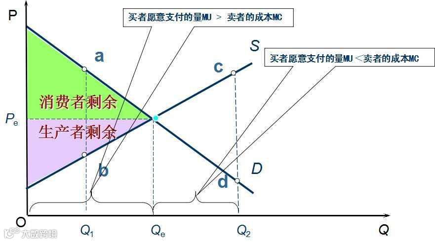 当市场达到均衡时,购售单价一致,供需数量平衡,买卖双方都得到最大满足,社会福利最大化,市场实现优化配置。