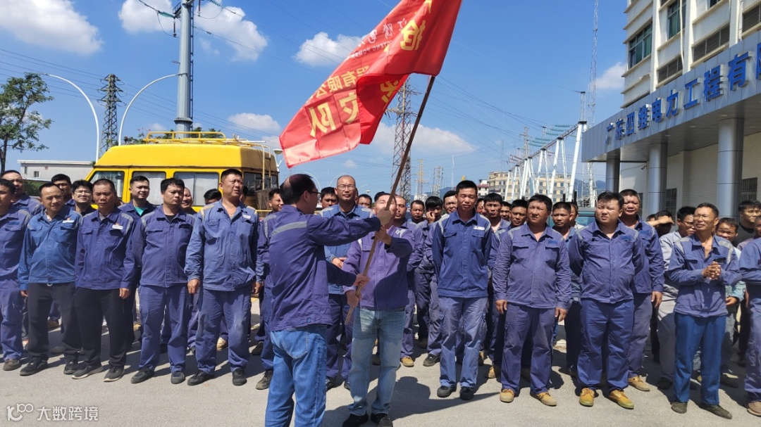 10月4日,江腾电力集团旗下施工企业完成集结。出发前,江门市国资委党委副书记、副主任李健斌,江门供电局总经理赖颖东,江门新会供电局党委书记梁沃涛来到江门明浩实业集团有限公司新会分公司为出征队伍鼓劲打气,分别将党旗、抢险救灾队旗、党员突击队旗授予抢修队伍。与此同时,江门、鹤山、开平、台山、恩平等地的公司陆续完成集结。