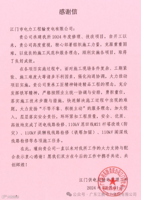 输变电公司收到江门供电局输电管理二所的感谢信。感谢信中称,输变电公司秉承工匠精神,勇担重任,快速解决施工过程中出现的难题,安全、优质、高效地完成了送电线路检修、110kV恩田线#21杆塔改造(防灾)、110kV洪狮线线路检修(铁塔加固)、110kV阁深线线路检修等2024年各项修理技改项目。