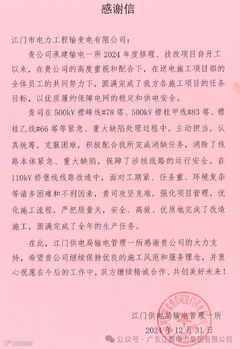 输变电公司收到江门供电局输电管理一所的感谢信。信中对输变电公司圆满完成输电一所2024年度修理技改项目,特别是500kV襟峰线#78塔、500kV襟桂甲线#83塔、襟桂乙线#66塔等紧急、重大缺陷处理,110kV桥堡线线路改造等项目建设表示感谢,赞扬输变电公司以优质履约保障电网的稳定和供电安全。
