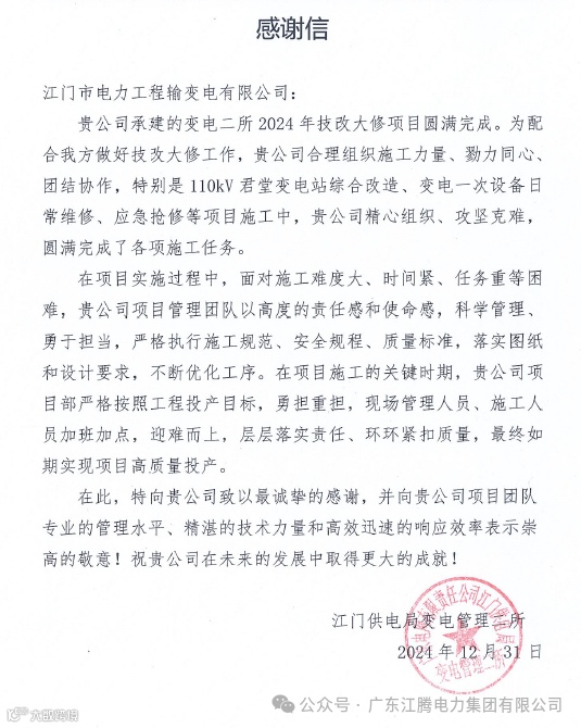 输变电公司收到江门供电局变电管理二所的感谢信。信中对输变电公司配合做好技改大修工作,圆满完成110kV君堂变电站综合改造、变电一次设备日常维修、应急抢修等2024年技改大修项目表示感谢,向输变电公司公司项目团队专业的管理水平、精湛的技术力量和高效迅速的响应效率表示崇高的敬意。