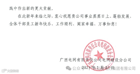 感谢信中称,2024年,广西电网公司电网建设分公司和江门输变电公司共同经历了机遇和挑战,双方携手前行,攻克难关,每一次的项目合作,每一次的交流探讨,都见证着彼此的合作和友谊,让双方的合作关系更加紧密。踏上新征程,希望双方持续深化合作,着力推动双方资源共享、优势互补、合作共赢。