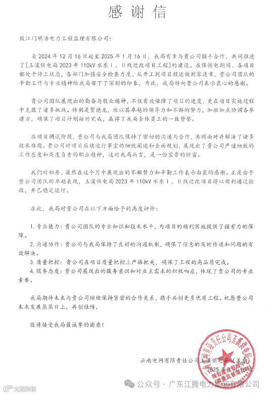 在新春佳节来临之际,广东江腾电力集团迎来了特别的礼物,广西电网有限责任公司电网建设分公司、云南电网有限责任公司玉溪供电局对江门市电力工程输变电有限公司、江门明浩电力工程监理有限公司的专业敬业精神和对项目的大力支持表示衷心的感谢。