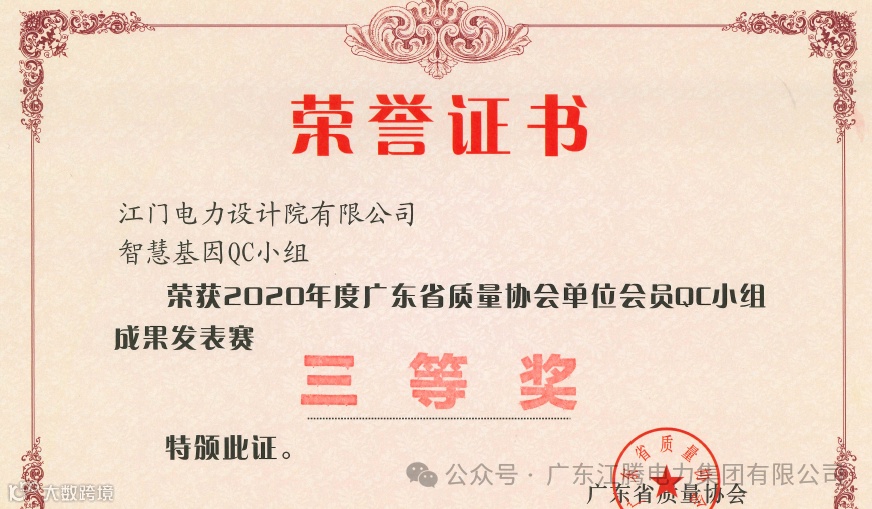 在工程设计中,江门电力设计院的智慧基因QC小组结合工程遇到的困难,应用公司7个自有专利技术,发布了5个QC成果,其中以“变电站智能运维技术应用研究”为题的成果,荣获广东省质量协会单位会员QC小组成果发表赛三等奖,赋予该项项目高新技术含量。