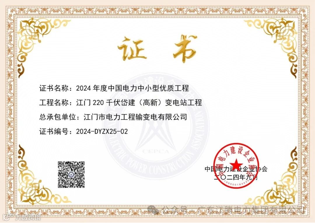 在喜获中国电力优质工程奖的同时,江门220千伏岱建(高新)变电站工程将继续争创“中国安装之星”,对企业提高业内影响力和在电力建设领域高质量发展具有重要意义。