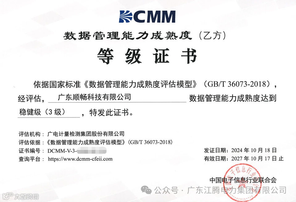 近日,广东顺畅科技有限公司(简称“顺畅科技公司”)成功通过了国家数据管理能力成熟度评估模型(DCMM)乙方三级认证,这一认证标志着顺畅科技公司在数据管理方面的成熟度水平获得官方认可。