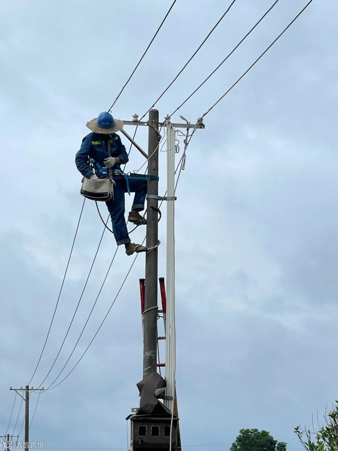 台风过后,明浩公司抢修人员在登杆更换低压导线