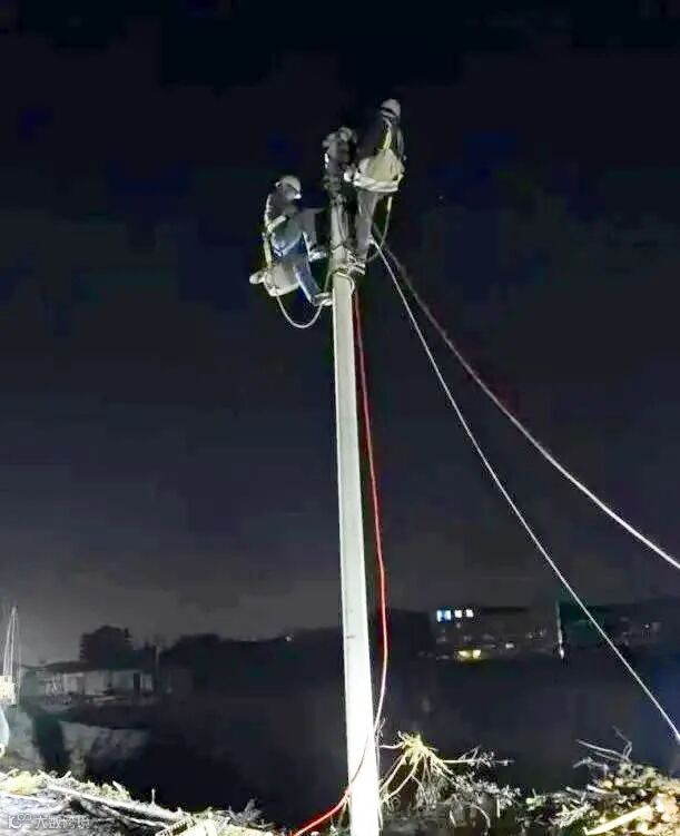 事故发生后,明浩公司迅速集结抢修力量,充足的作业前准备后,抢修人员迅速对断线、倒杆等情况进行抢修,立杆、拉线、换线、金具安装等各项工作紧张而有序开展。抢修人员克服夜间故障处理光线不足、工作难度大等工作不利因素,每个人都有条不紊地进行着自己的工作,传递材料、换金具、接架空线路、拉线……夜已深,黑压压的天空,周围一片寂静,只有工具相互的碰撞声。