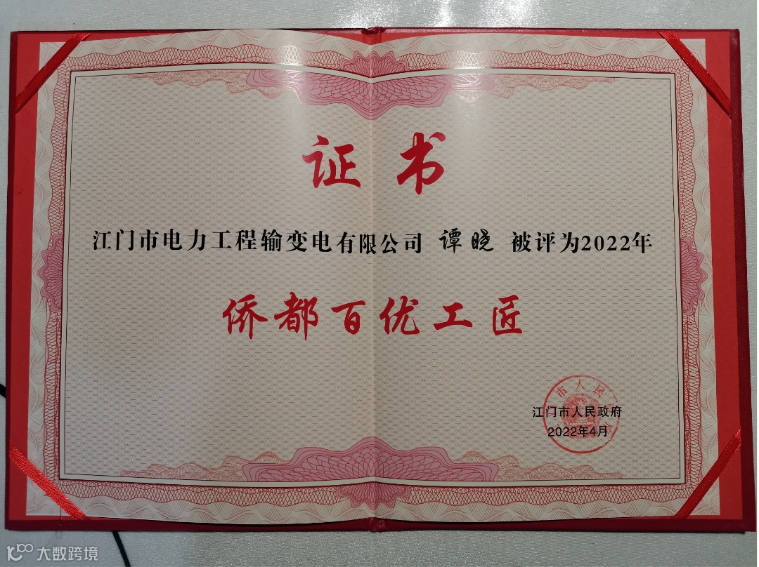 近日,以“匠心强担当 建功新时代”为主题的2022年江门市“侨都工匠”评选活动颁证大会在江门市文化馆举行。江门市电力工程输变电有限公司谭晓被授予2022年江门市“侨都百优工匠”,为“江门制造”和“邑电达”品牌增光添彩。
