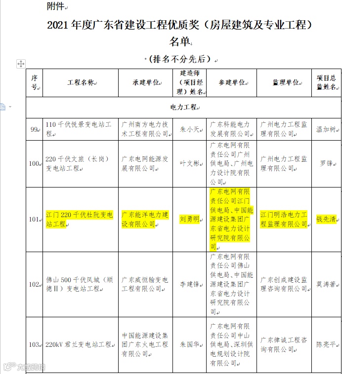 近日,江门明浩电力工程监理有限公司参建的“江门220千伏杜阮变电站工程”荣获广东省建筑业协会2021年度广东省建设工程优质奖。