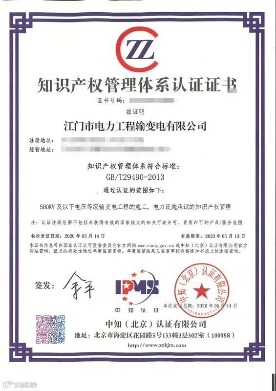 导读:近日,江门市电力工程输变电有限公司凭借知识产权管理体系的规范性、严谨性,顺利通过国内权威知识产权认证机构——中知(北京)认证有限公司的外审,成功获得该管理体系认证证书。