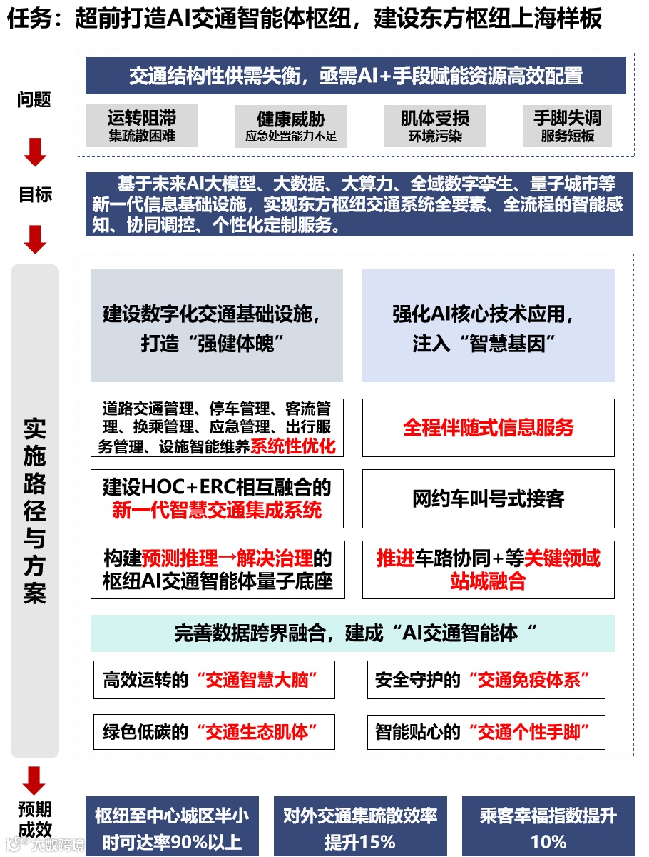 作为上海新一轮城市建设的“超级工程”,东方枢纽集高铁、地铁、航空、公交于一体,日均客流量预计数十万人次。针对大型交通枢纽供需失衡、打车难、停车难、换乘难、客流堵、道路堵的问题,运用AI大模型、大数据、大算力、数字孪生等技术,并借助AI智能体统筹管理、协同调控,实现资源高效配置、全程伴随式个性化定制服务、需求响应式公交接驳、即停即走网约车叫号式接客、多跨平台的站城融合式Maas服务、使枢纽运行达到系统运转高效、旅客换乘便捷、车流出入顺畅的效果。