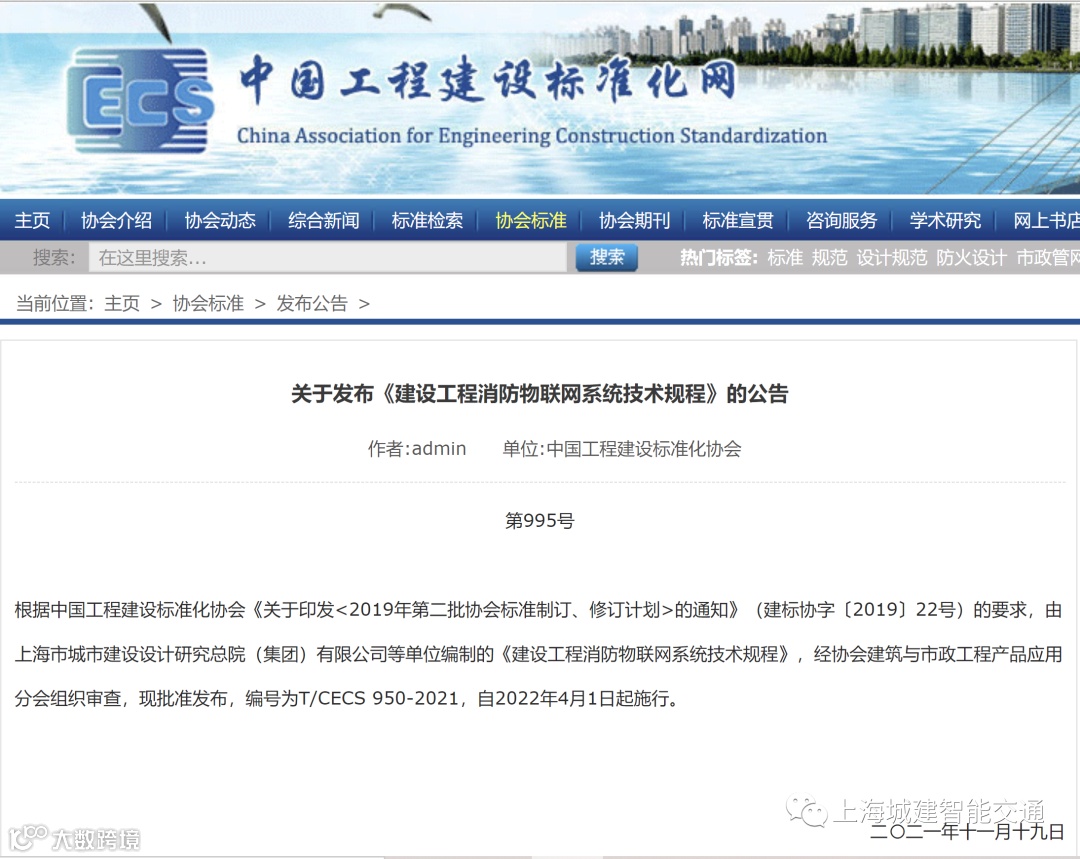 近日,由上海市城市建设设计研究总院(集团)有限公司主编的中国工程建设标准化协会标准《建设工程消防物联网系统技术规程》T/CECS 950-2021已批准发布。
