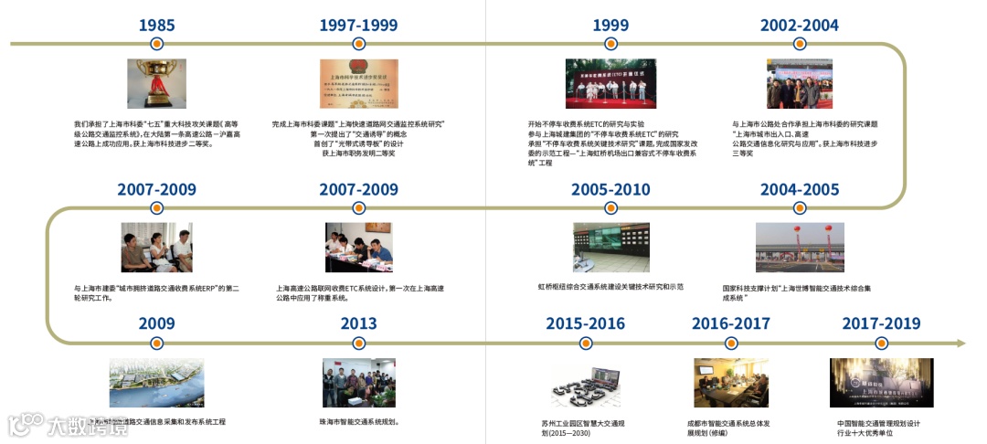 ⾃1985年开展上海市科委“七五”重⼤科技攻关课题《⾼等级公路交通监控系统》的研究起,从80年代的交通监控、交通信号控制,到90年代的快速路、桥隧监控、交通诱导、ETC,再到如今大数据时代的车路协同、智慧交通、自动驾驶、交通信息平台等业务,智慧城市院30多年来,⼀直在学习、吸收并创新。