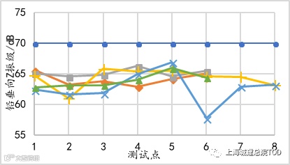 图3是4F综合楼、5F综合楼、车辆段上盖平台的34个测点的电车收发车或电车检修引发的上部结构振动的铅垂向Z振级计算结果。参考《城市轨道交通引起建筑物振动与二次辐射噪声限值及其测量方法标准》 ,综合楼的振动限值为70dB,从图3中可看出,4F综合楼、5F综合楼、车辆段上盖平台的铅垂向Z振级在64dB附近,均未超过限值,综合楼以及车辆段的上盖平台的振动舒适度满足要求。