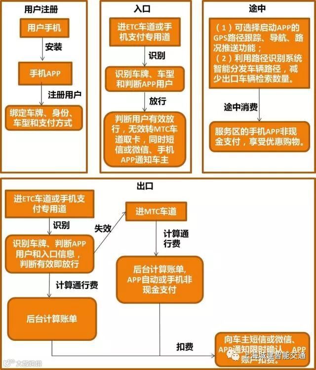 手机APP 功能至少应包含个人中心、充值与支付、短信验证、出行服务、客服与申诉、记录查询等一站式的高速通行服务功能。手机APP还可提供智能路况提醒和诱导,根据用户的位置智能推送和语音预告前方路况并进行智能诱导,对排堵保畅、减少事故、均衡路网等都有积极作用。