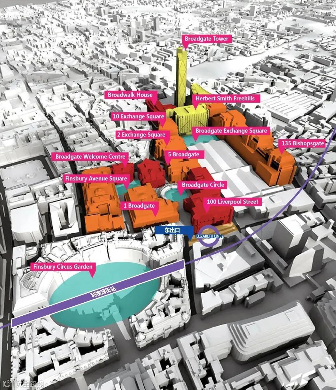 利物浦街站是伦敦金融城最大的综合交通枢纽,地下铁、地上铁、市郊铁路、长途铁路多线聚集于此,因此利物浦街站成为近三十年来伦敦金融城持续更新规模最大的一个区域。利物浦街站周边的角角落落都进行了或增量或提质的更新改造,比如在百年前的铁轨上方开发的Exchange House、伦敦少有的地下商业开发Broadgate Circle等。