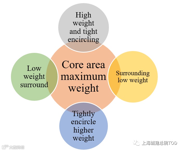 The combined space by weight attribute level (see Figure 3) is distributed from large to small by attribute weight of traffic mode to peripheral area. The distance between the largest modes of traffic exchange is the shortest, so as to quickly distribute the flow of people and improve the service level of the high-level traffic mode with high weight.