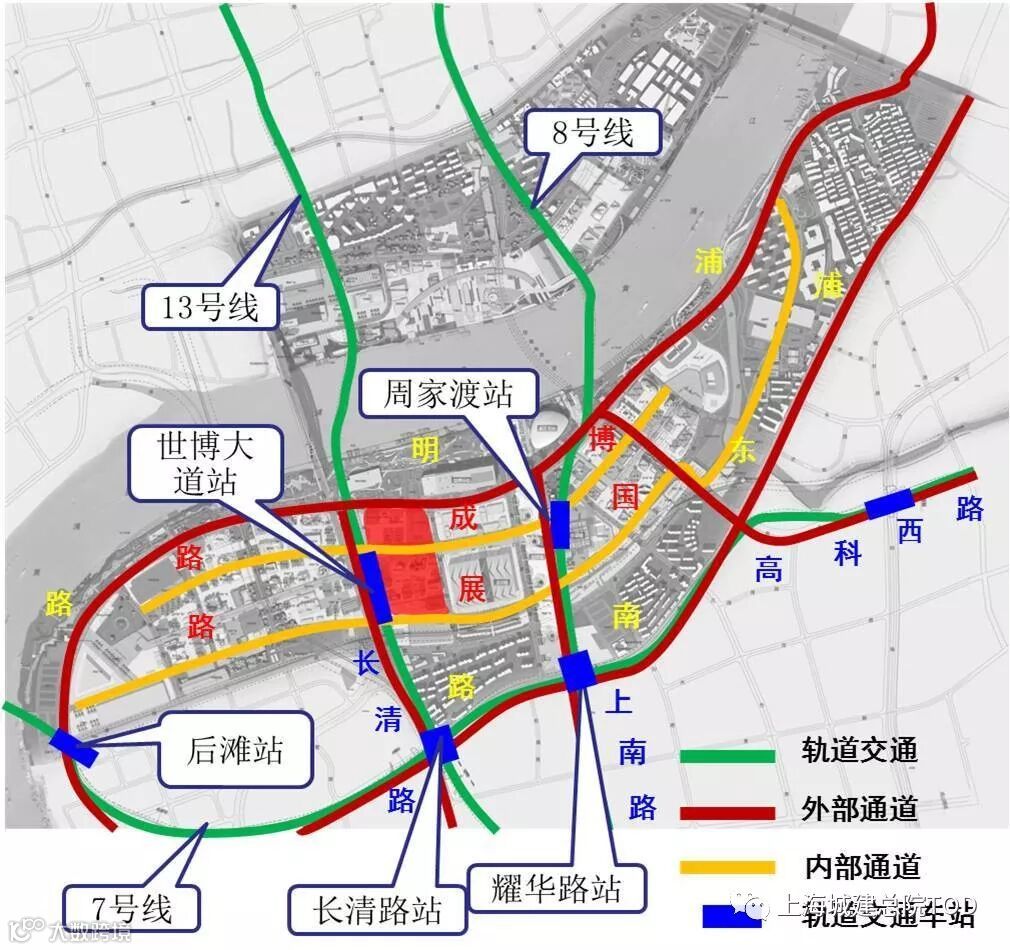 基地范围内有轨道交通13号线—世博园站,车站东侧的两个出入口设置在地块内,出入口处有预留与地块的接口。基地外,紧邻中国馆有轨道交通8号线周家渡站,可通过地下通道与世博园站连通。