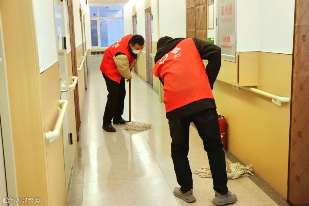 服务队精心准备了大米、面粉、食用油等贴合老年人实际需求的慰问品。在工作人员引导下,志愿者走进老人居住区,与他们促膝谈心,耐心倾听他们的过往故事,为老人捶背揉肩,闲话家常,温馨氛围萦绕现场。交谈之余,志愿者主动开展义务服务,拿起扫帚、抹布等工具,对康养中心的公共活动区域、走廊、卫生间等场所进行了彻底清扫保洁,为老人们营造更加整洁舒适的生活环境。