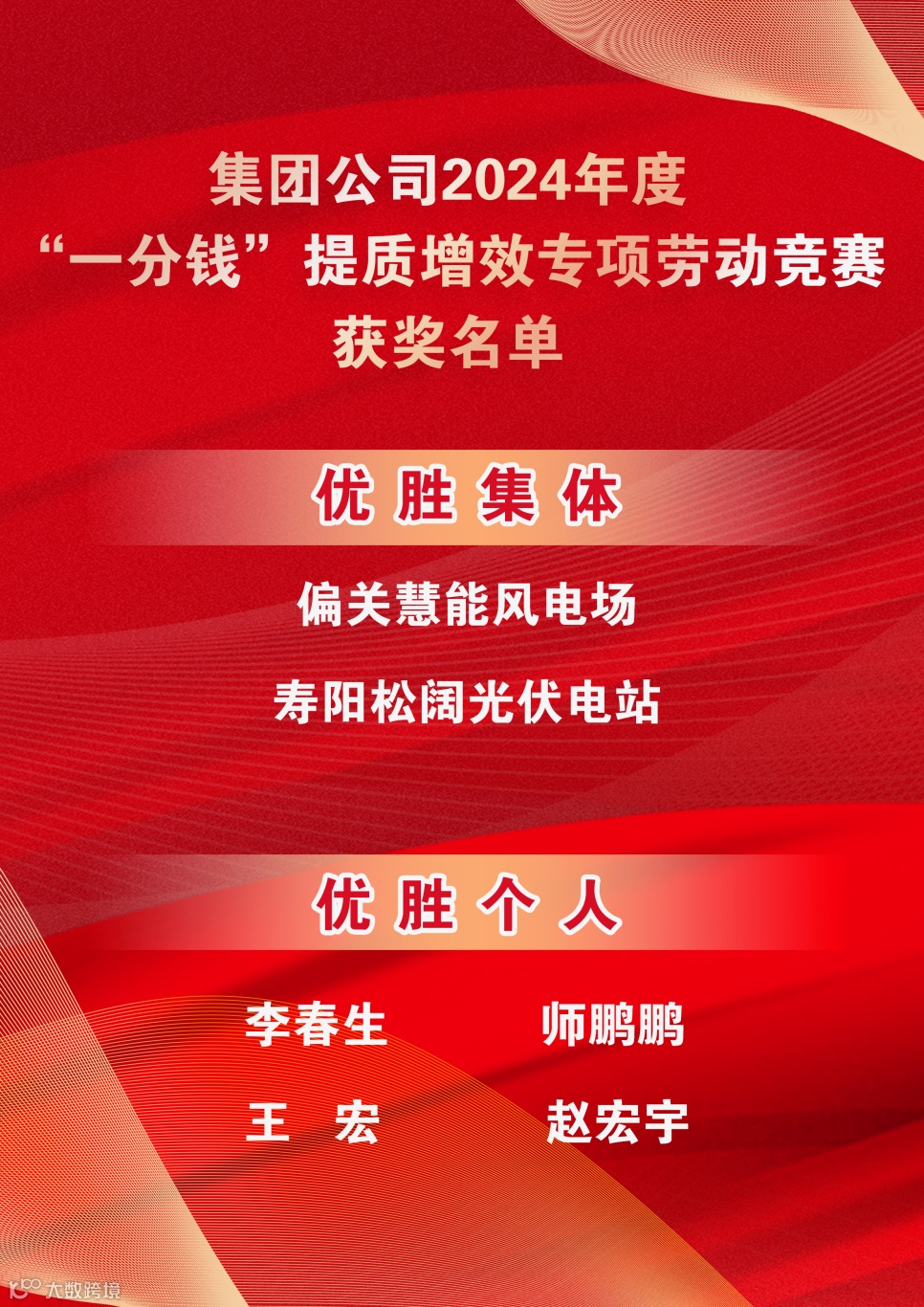 在集团公司2024年度“一分钱”提质增效专项劳动竞赛表彰中,山西公司偏关慧能风电场、寿阳松阔光伏电站荣获优胜集体,李春生、师鹏鹏、王宏、赵宏宇荣获优胜个人。荣誉背后,是一线劳动者用精细到毫厘的执着,他们向成本要效益,向内部挖潜力,在工作岗位上书写了提质增效的精彩篇章。