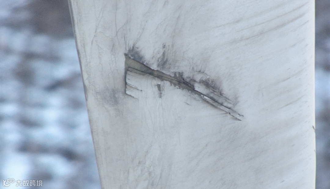 当无人机飞至F15风机的SS面距离叶尖约1.2米处时,突然出现了斜向停滞,李春生凭借多年的职业敏感立刻意识到情况不妙,迅速调整无人机的摄像倍率,眼睛紧盯着屏幕。果然,在F15风机叶片的SS面叶尖漆面上,一条约30厘米长的裂缝清晰地显现出来,他立即将情况详细报告给了场站。