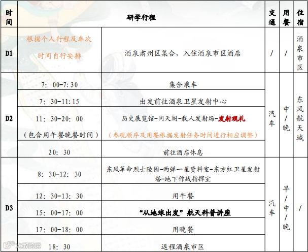 住宿:酒泉携程四钻酒店1晚(含早),中国酒泉卫星发射中心研学楼1晚(含早)