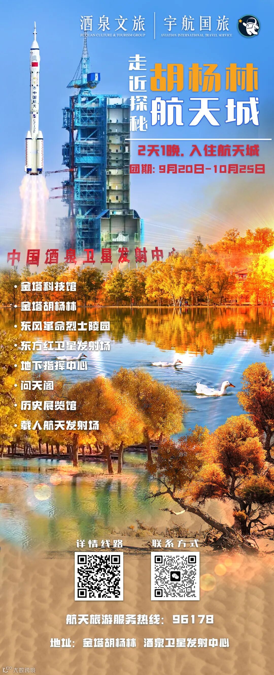 酒泉卫星发射中心+金塔胡杨林,2天1晚深度游报名通道已开启。9月20日-10月25日探访戈壁奇迹,需提前3-5天预约报名