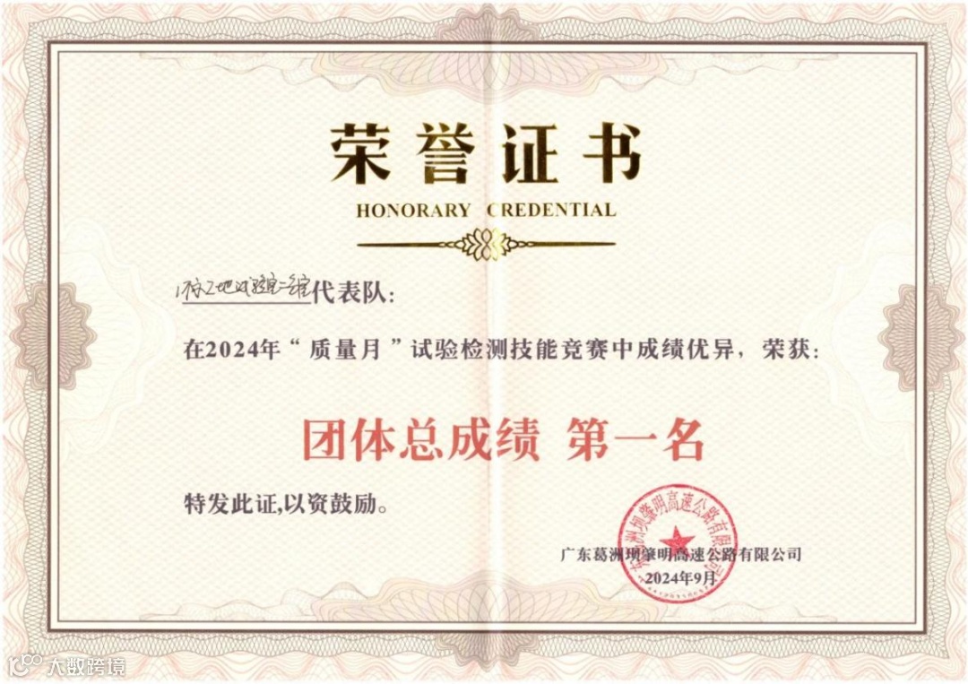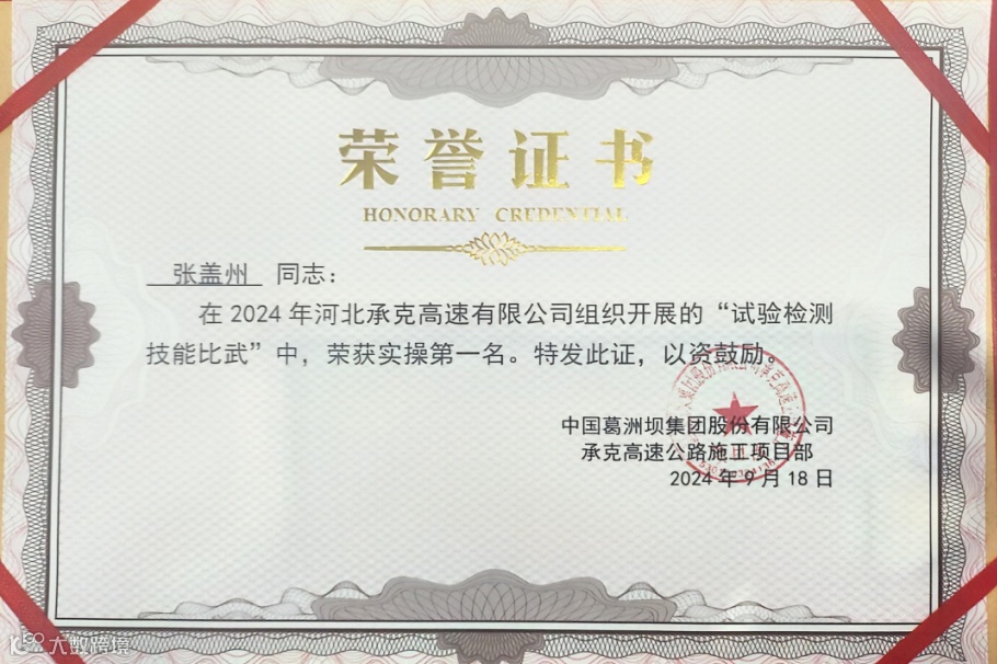 9月30日,河北承克高速项目2024年试验检测技能比武中,李德民获理论第一名,武宇、张盖州获实操第一名,公司获评2024年质量先进单位