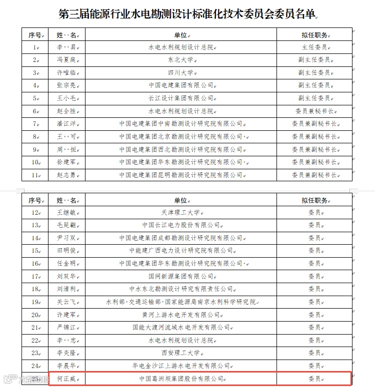 近日,能源行业水电勘测设计标准化技术委员会(NEA/TC15,以下简称“标委会”)完成第三届标委会换届。经国家能源局审核通过,第三届标委会由35名委员组成,总院党委书记、院长何正威任委员,据悉,这也是中国能建葛洲坝集团专家首次担任该一级标委会委员。同时,总院水电院支部书记、副院长储威威入选该委员会水工设计分技术委员会(NEA/TC15/SC2)委员。