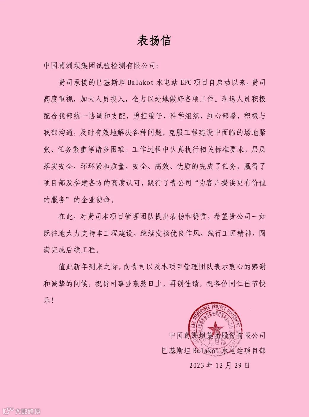 中国葛洲坝集团股份有限公司巴基斯坦 Balakot 水电站项目部向公司所属试验检测公司发来表扬信,对试验检测公司为项目建设所作出的贡献给予高度肯定。