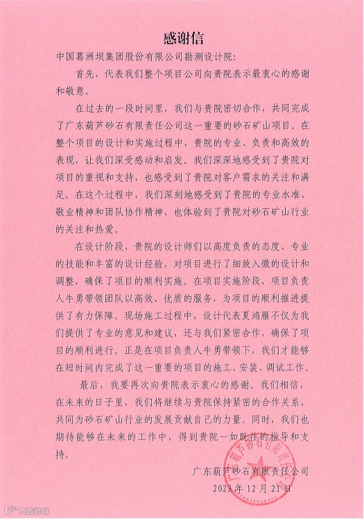 广东葫芦砂石有限责任公司向公司发来感谢信,对公司表示充分肯定,“在整个项目的设计和实施过程中,贵院的专业、负责和高效的表现,让我们深受感动和启发。我们深刻地感受到了贵院的专业水准、敬业精神和团队协作精神,也感受到了贵院对客户需求的关注和满足。”