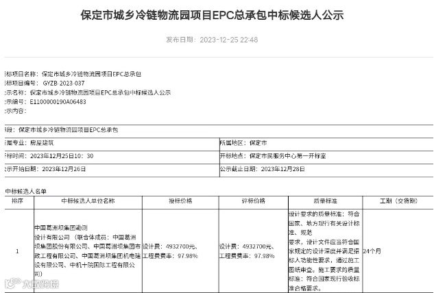 近日,公司EPC总承包业务在北方区域再传“捷报”:公司孵化、投标的保定市城乡冷链物流园EPC项目于12月28日结束公示,公司牵头联合体排名第一!