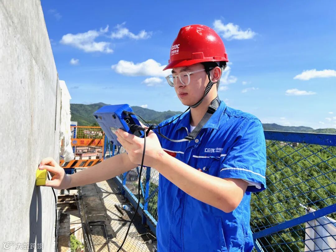肇明高速公路施工现场,项目试验员马一不惧高温,顶着炎炎烈日在三十余米的高空上开展桥梁结构检测,为工程质量保驾护航。