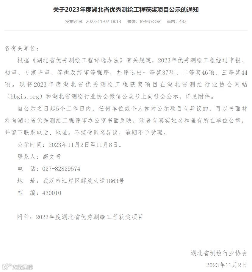 11月8日,“2023年度湖北省测绘优秀工程奖”结束公示,公司申报的“公安县民政局乡镇勘界项目”荣获二等奖。该项目是公司首个确权类勘界项目。