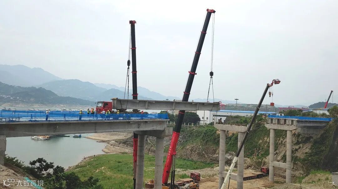 本次合龙的交通桥连接项目东西两侧基地。该交通桥桥梁上部结构采用4×30m预应力混凝土T梁,因T梁梁高2米,桥面宽度12米,桥面距河床23米,T梁上桥吊装时面临跨度大、重量大、吊装高度大的难题,需要选用大吨位的吊车及运输车辆,且桥梁两端来往人员和车辆较多,这让运输和吊装的安全系数要求格外严苛。