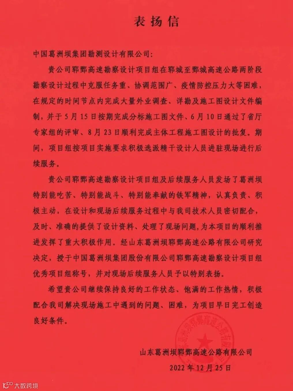 山东葛洲坝郓鄄高速公路有限公司发来表扬信