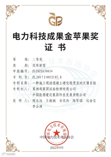 近日,自中国电力市场协会获悉,由公司研发团队主导、中国能建科技发展公司参与研发的“一种施工现场混凝土硬化程度实时反馈系统”(以下简称“该系统”),获2022年“金苹果”知识产权(专利)二等奖。