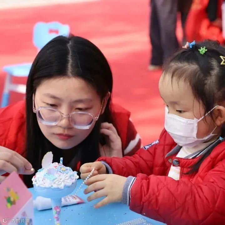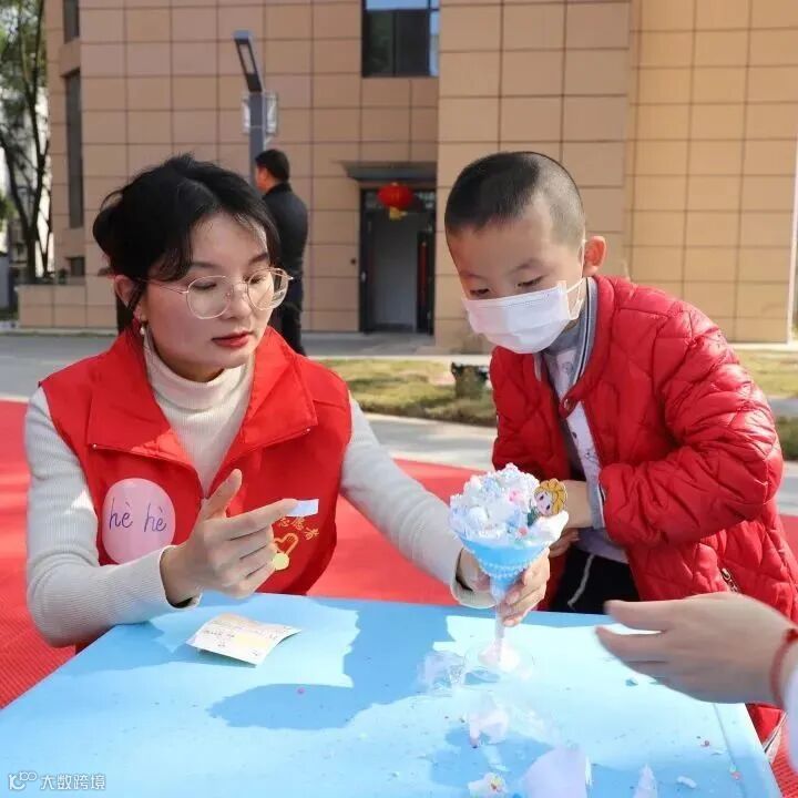 2名志愿者与1位小朋友结对子,一起制作“奶油冰激凌杯”手工,过程中小朋友们欢声笑语,脸上着洋溢笑容