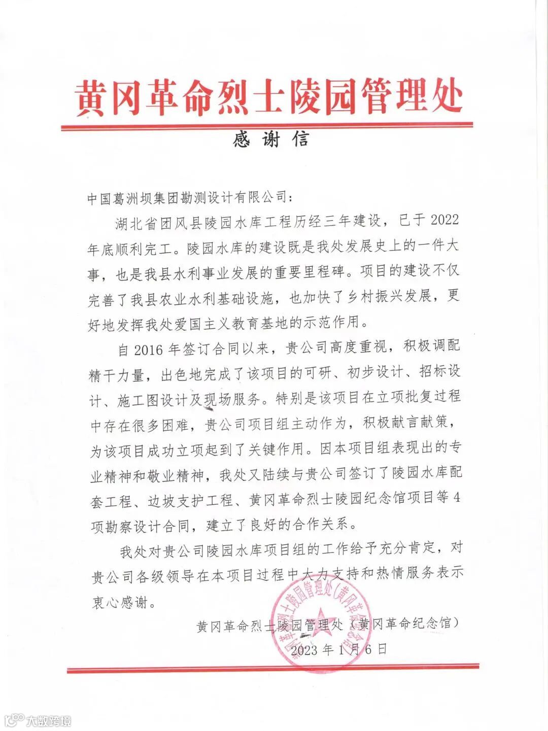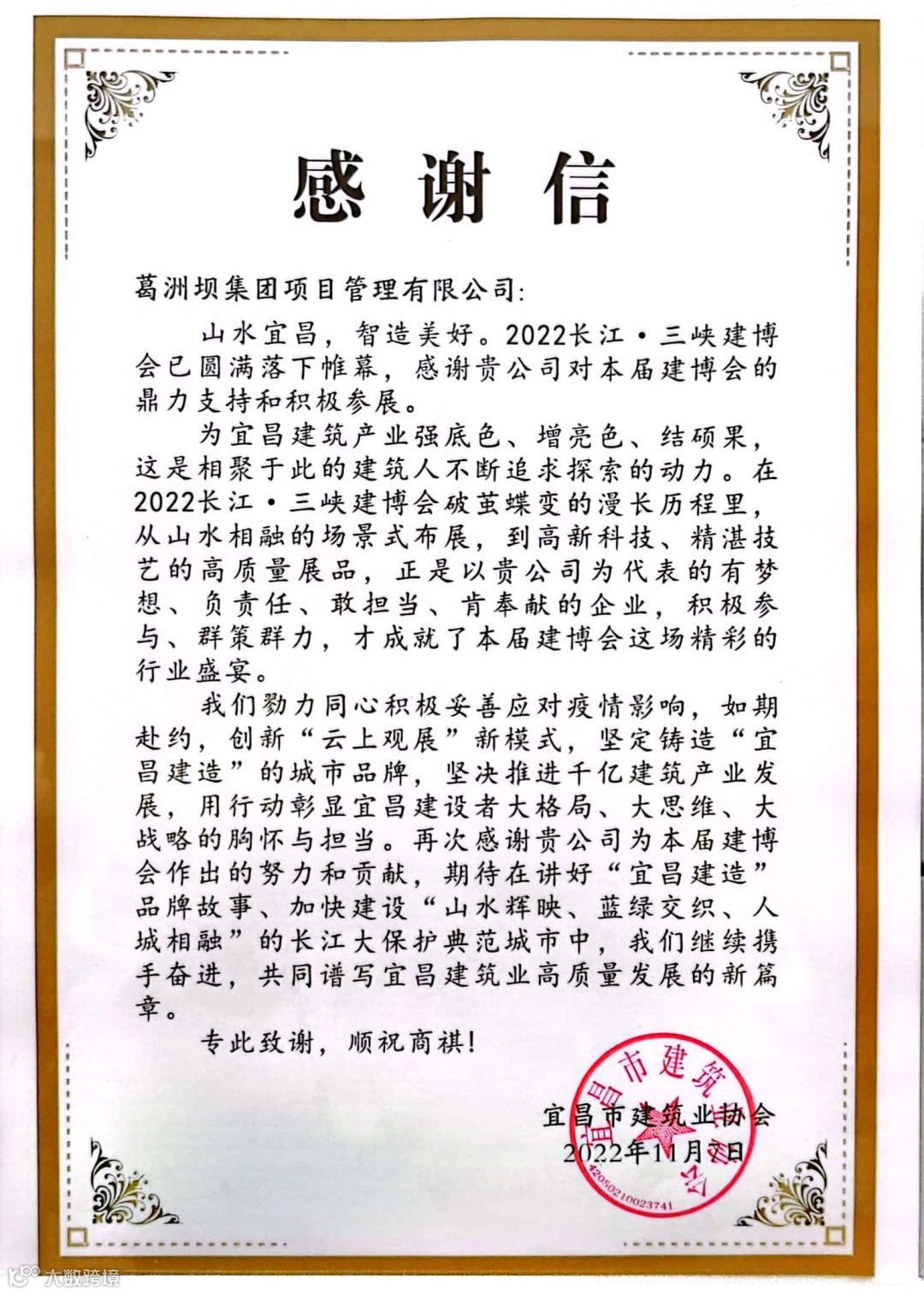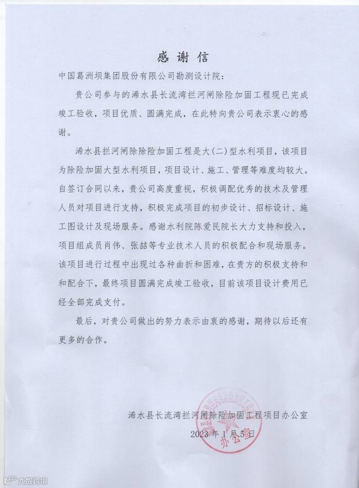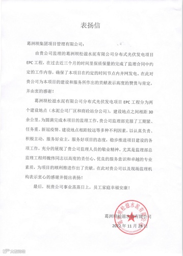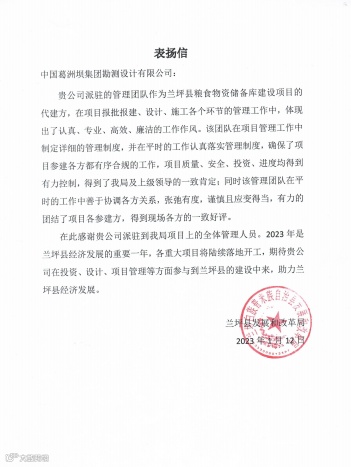 公司收到鄂州市政府投资工程管理中心、葛洲坝松滋水泥有限公司、兰坪白族普米族自治县水利局水系连通建设管理局、宜昌市建筑业协会发来的4封感谢信,感谢公司在现场管理、监理等项目管理业务能力的肯定!