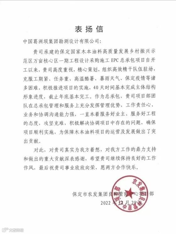 公司收到保定市农发集团良种繁育中心项目部、兰坪县发展和改革局发来的感谢信,是公司通过设计牵引开展EPC总承包业务能力的重要见证!