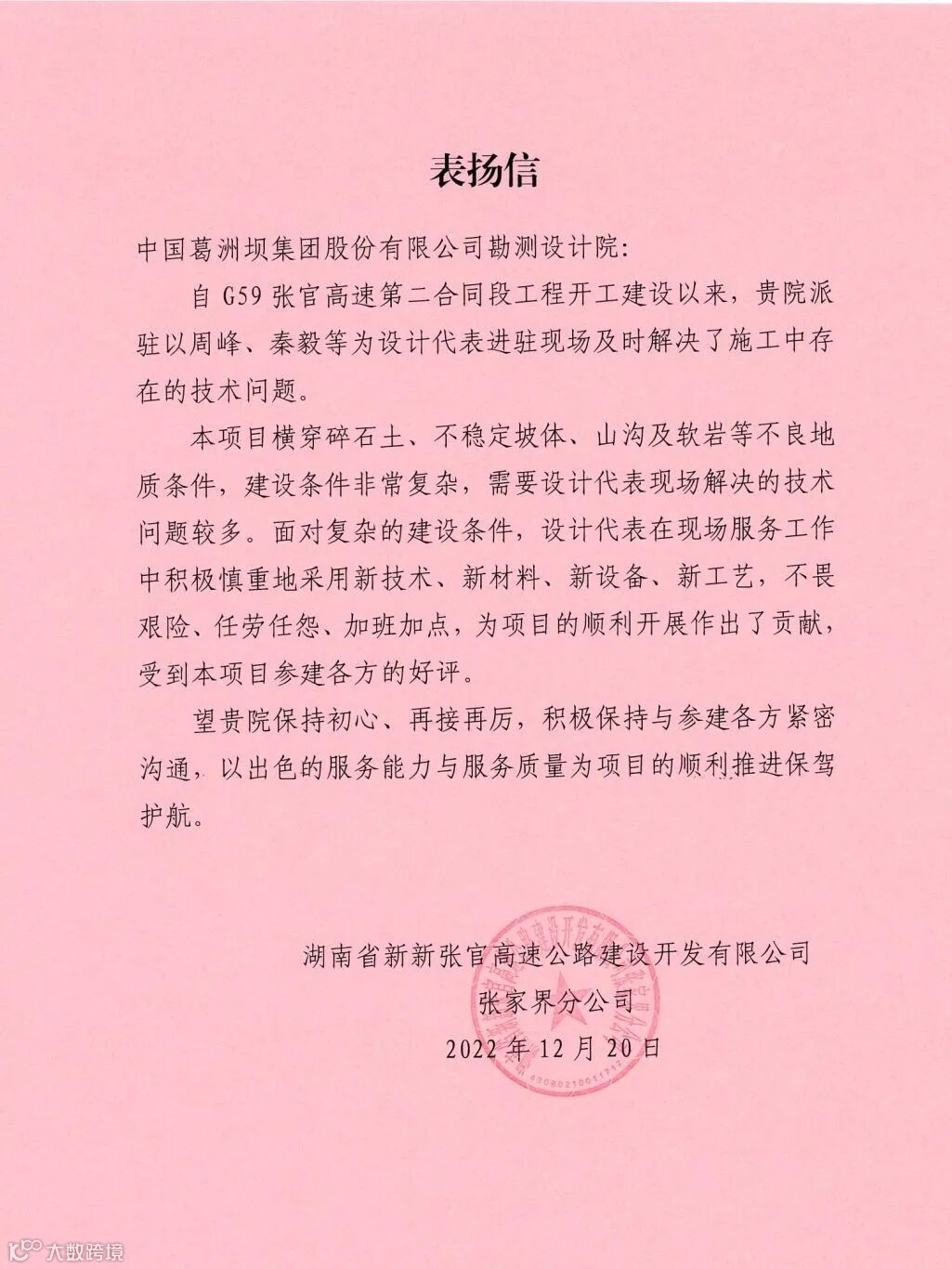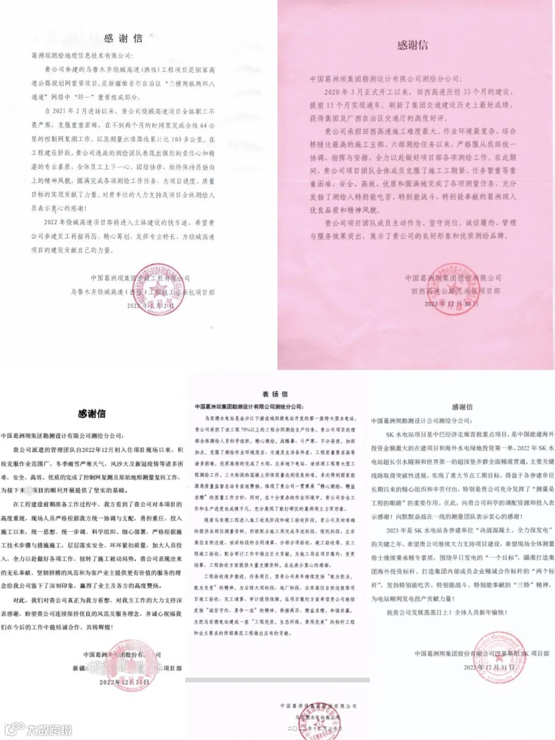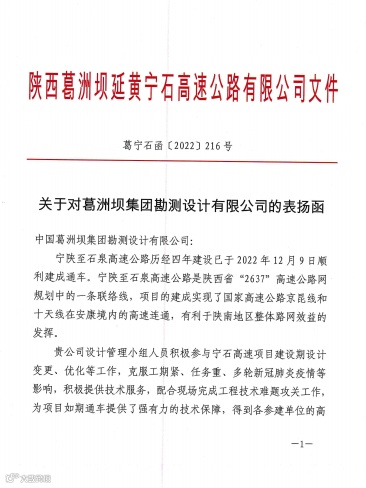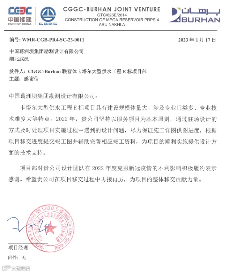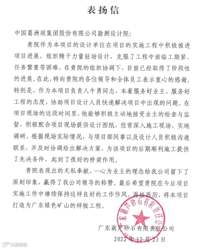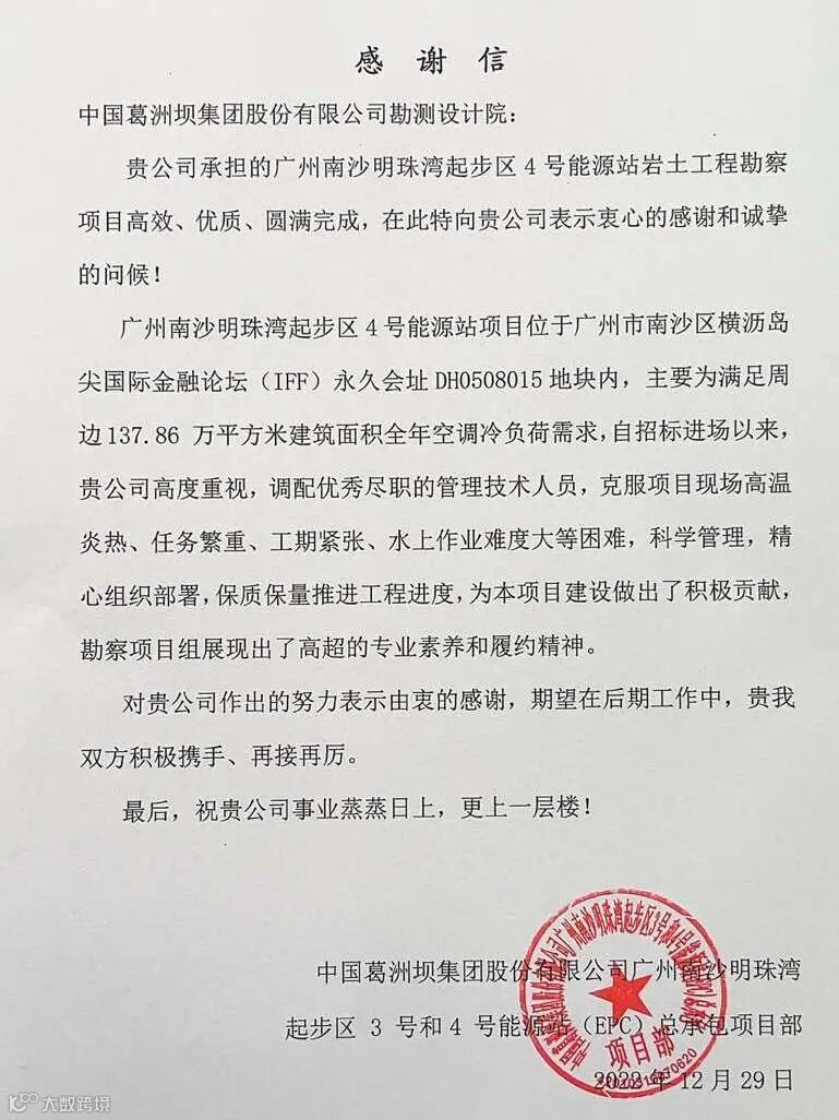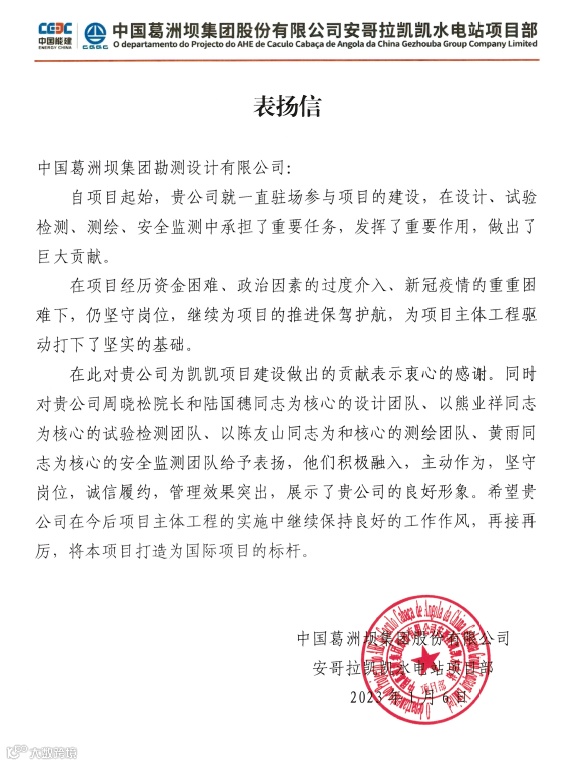 公司收到广西葛洲坝田西高速公路有限公司、集团安哥拉凯凯水电站项目部发来的感谢信,感谢公司发挥勘察设计、试验检测、测绘监测、项目管理等一体化优势,为项目推进作出重要贡献!