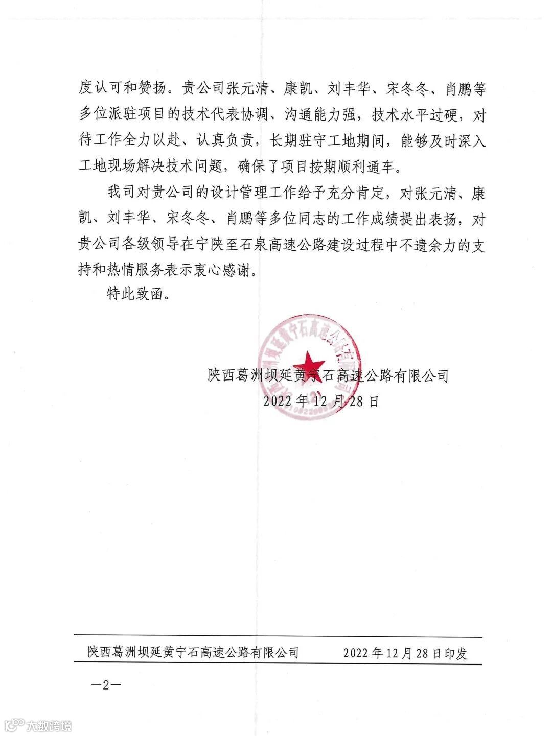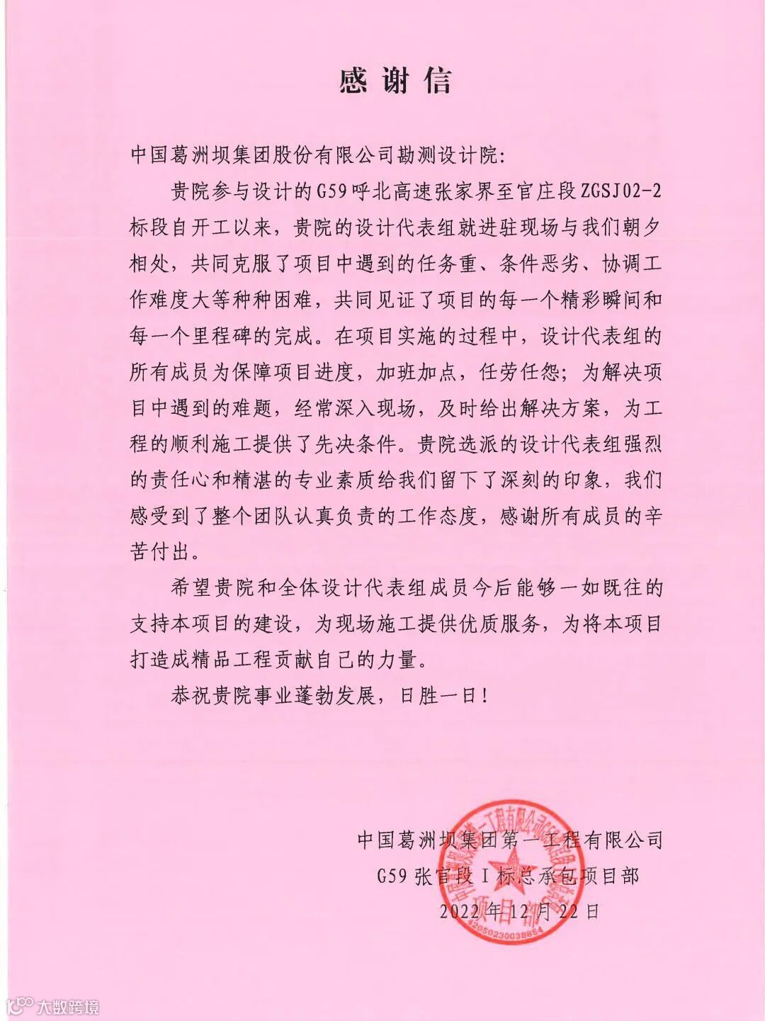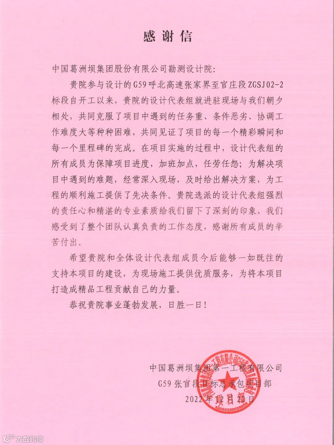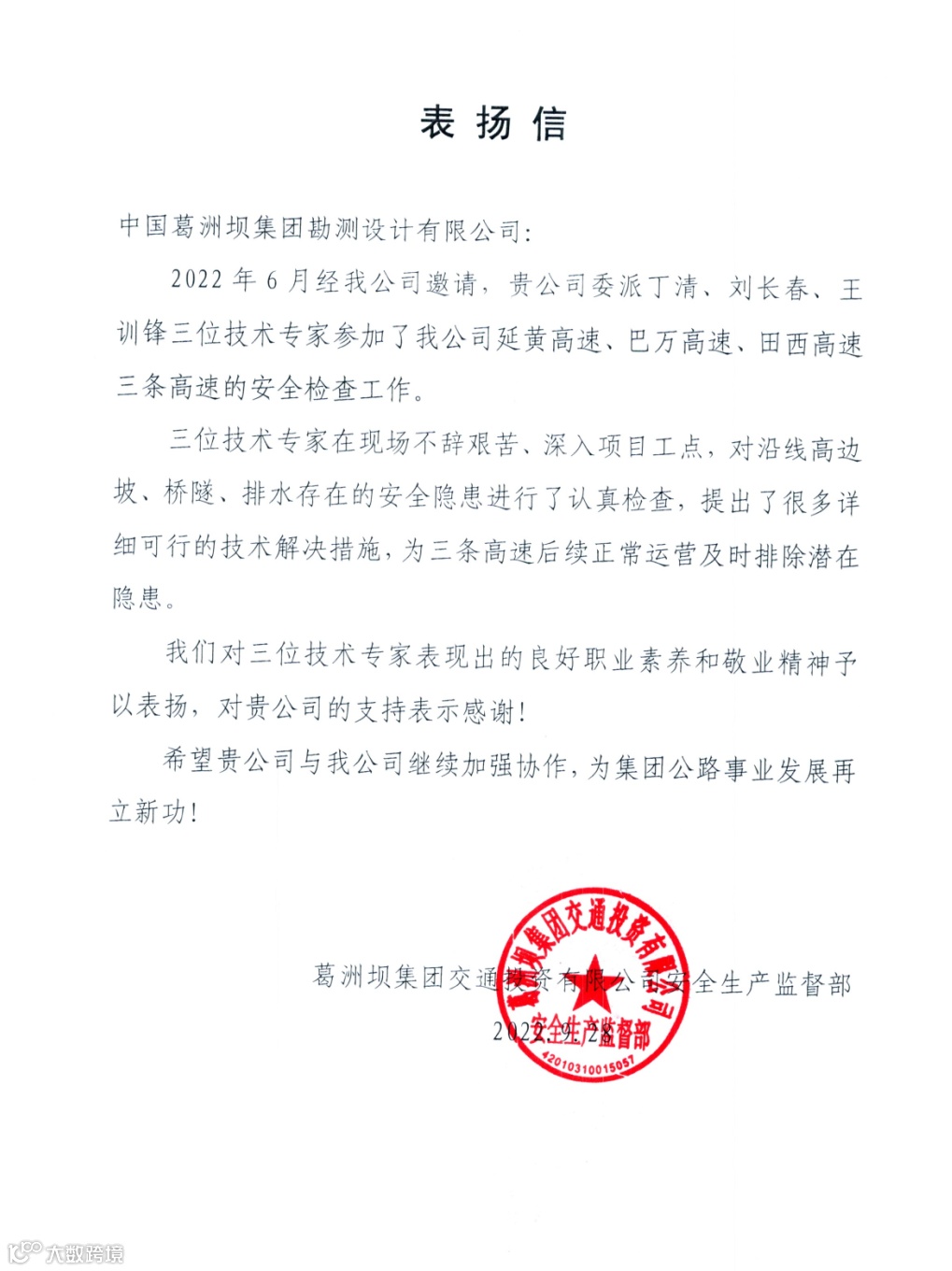公司收到广西葛洲坝田西高速公路有限公司、集团安哥拉凯凯水电站项目部发来的感谢信,感谢公司发挥勘察设计、试验检测、测绘监测、项目管理等一体化优势,为项目推进作出重要贡献!