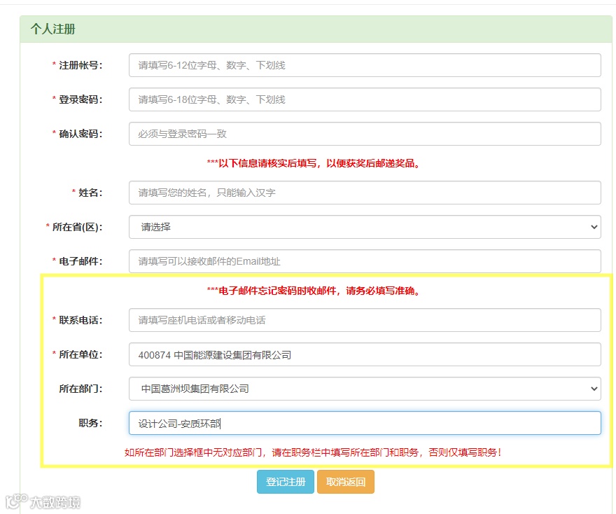 “职务”一栏,统一填写“中国葛洲坝集团有限公司+设计公司+部门/成员单位名称/直管项目部”;
