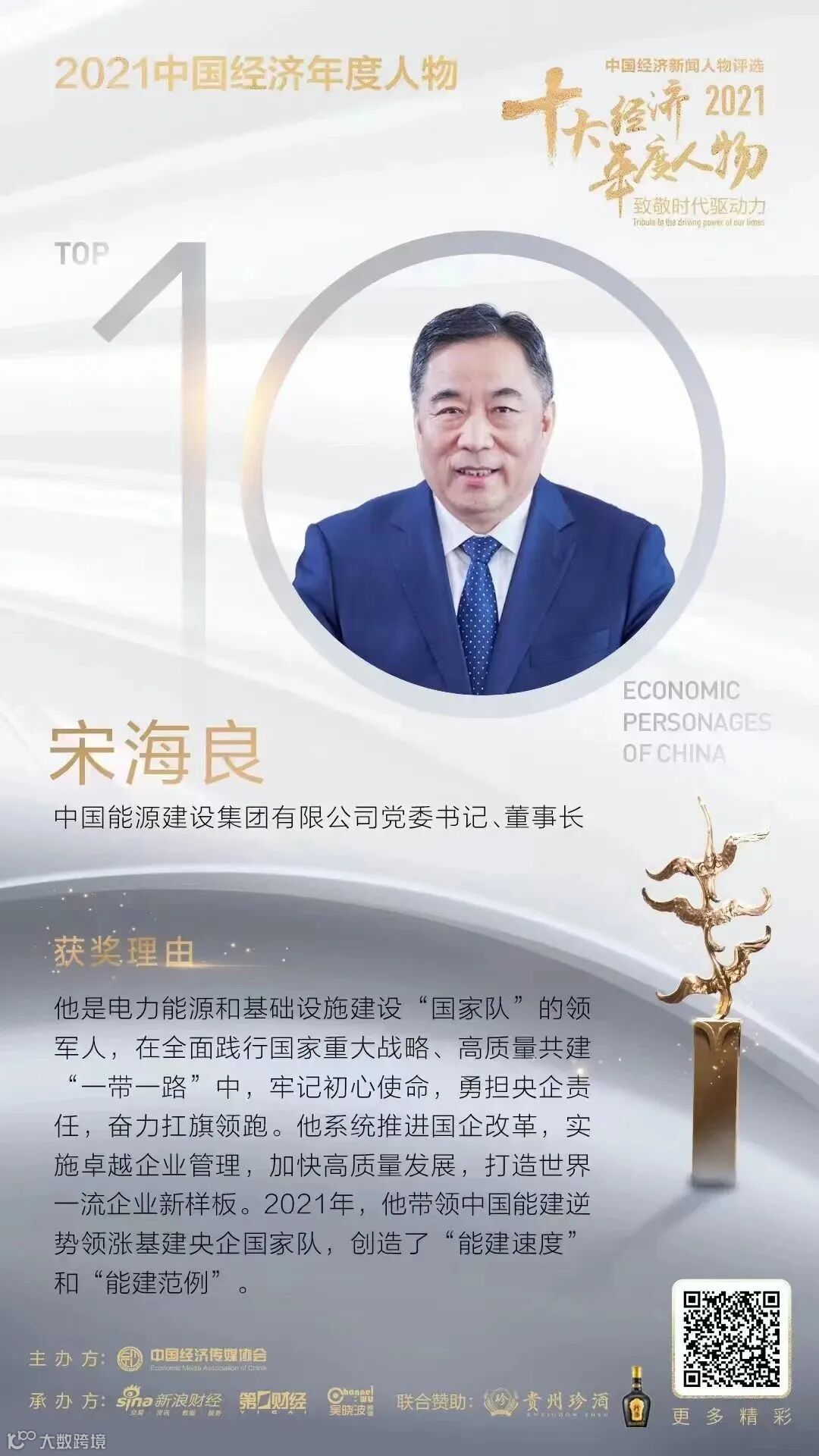 “中国梦杯•中国经济新闻人物——2021十大经济年度人物”评选活动由中国经济传媒协会主办,从“创新性、颠覆性、前瞻性、成长性、持续性”五个维度出发,评选2021年引领商业之美、产业创变、时代之潮的十大经济年度人物和经济年度人物新锐奖得主。
