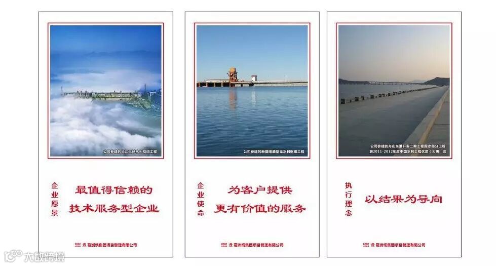 近日,经过精心设计制作,六块精美的企业文化理念展示牌出现在项目管理公司会议室墙壁上,这些以项目管理公司近年来参建项目的图片和勘测设计公司六条文化理念相结合的宣传展示牌,与项目管理公司会议室相对古朴的装饰相呼应,形成一道亮丽的“新风景”。