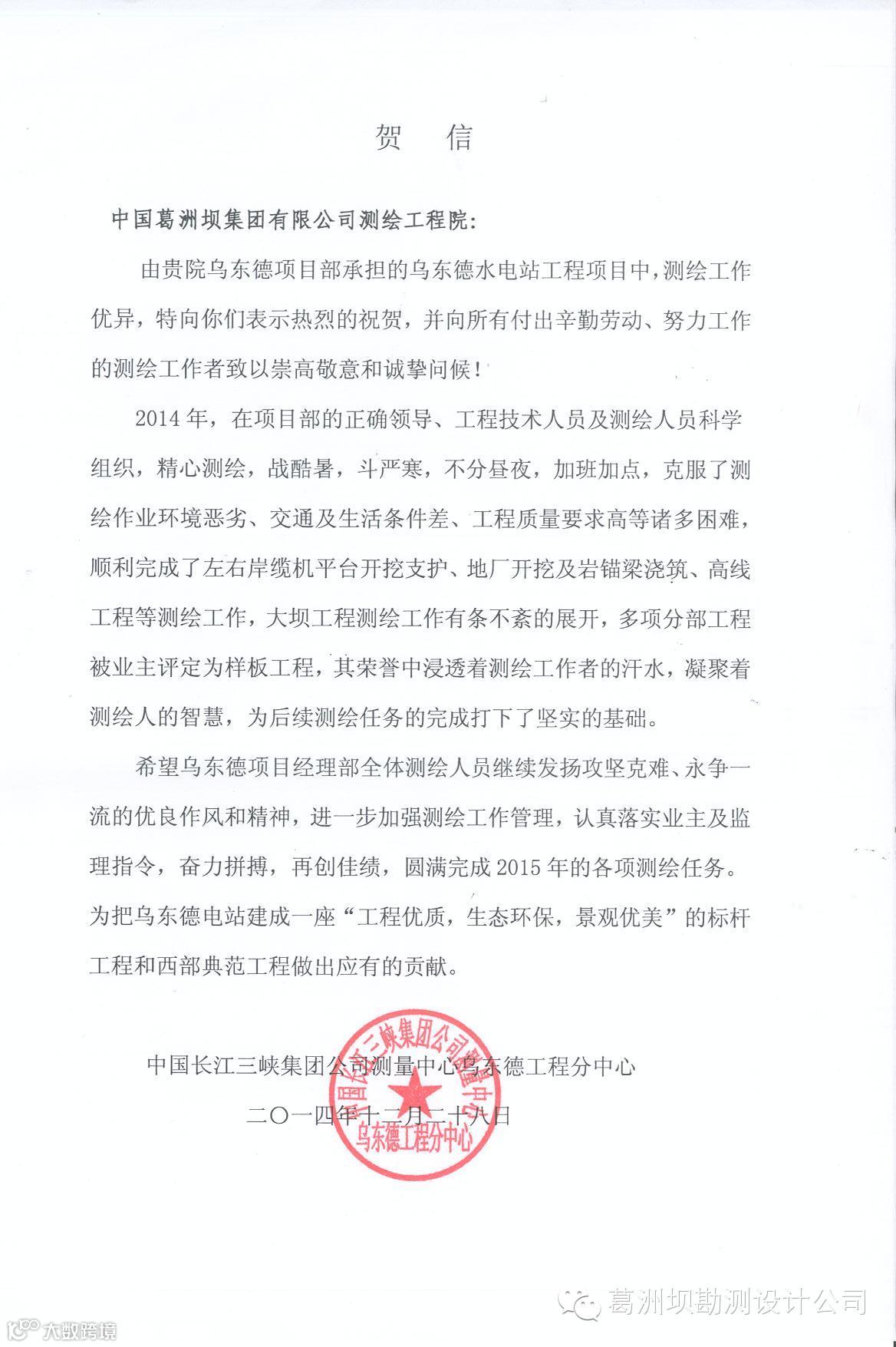近日,测绘工程院乌东德项目部收到中国长江三峡集团公司测量中心乌东德工程分中心的一封贺信。贺信对乌东德项目部的测绘工作表示高度肯定。