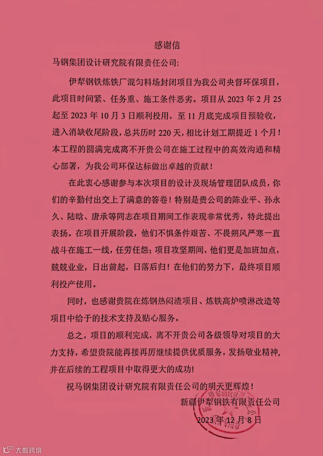 业主发来的这封感谢信,既是对马钢设计院的荣誉,也是马钢设计院的动力。2024年,马钢设计院将继续秉承客户至上的理念和攻坚克难的奋进精神,不断为产业生态圈“高端化、智能化、绿色化、高效化”高质量发展作出更大的贡献。