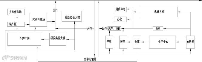 停车:一期小车停车位主要位于精骨料生产办公楼和倒班休息楼周边,大货车停车位主要为砂石运输平台前面广场位置,靠近出口处,二期的小车停车位置位于办公楼和研发实验楼前面,大货车停车位设置PC构架堆放处,靠近装货区,方便管理装货、运输和出行。
